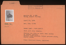 | Description: | Back part only remains. On discus, two fishes to left; on rim, series of double spirals. Handle, semi-pierced, triple grooved above, double below. Unglazed. Chocolate-brown clay. Type XXVIII of Corinth collection. | |