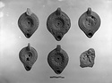 Grapevine pattern on rim; rosette on discus; palm branch, within double groove, on bottom. Air hole at base of nozzle. Solid handle, triple grooved above; double below; leaf motifs at bottom.