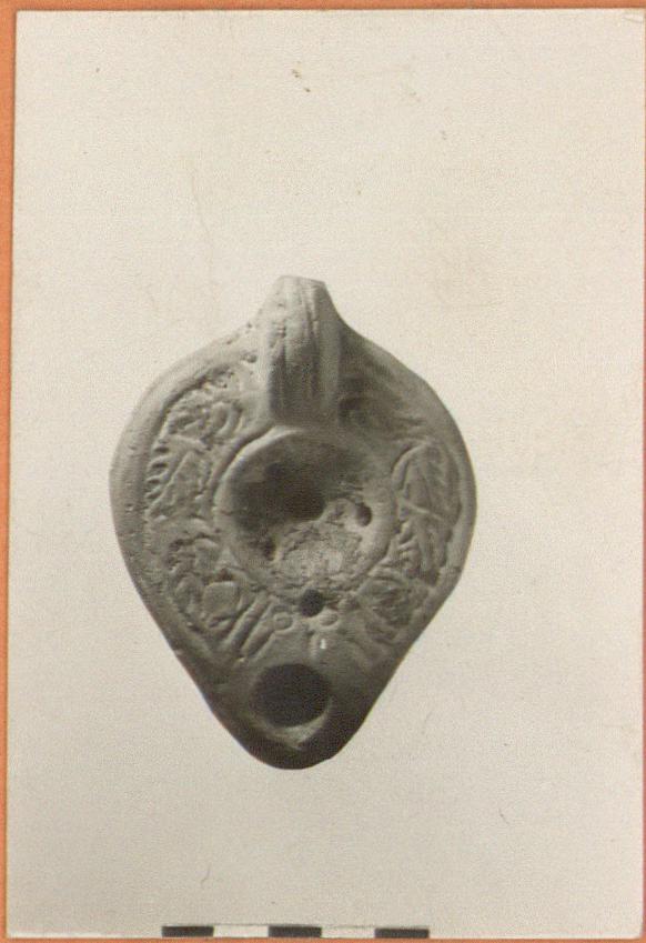 | Description: | On rim, vine pattern. Discus, plain, with central filling hole, four air holes. Handle, solid, double grooved. On base, almond-shaped grooves, palm branch and stamped circles. Unglazed. Red clay. Type XXVIII of Corinth collection. ADDENDA For nozzle, cf. Corinth IV, ii, p. 105, fig. 49, p. 2. | |