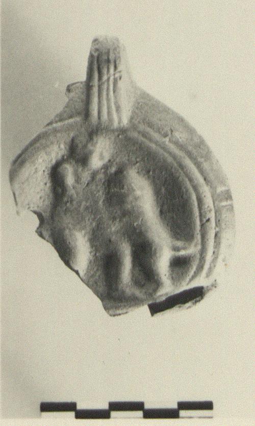 | Description: | Nozzle, left side including rim, and most of reverse missing. Plain panelled rim. On the discus, Herakles and the Nemean lion (?). Solid handle, with three grooves above and two below. Circular reverse with double grooves. The mold very worn. Red glaze. Light red clay. Type XXVIII of Corinth collection. | |