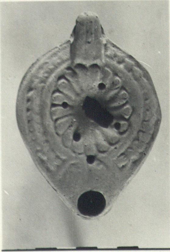 | Description: | Intact except for chips from discus. Herringbone rim; rosette on discus; central filling hole with four other smaller filling holes. Solid handle, partly pierced; two grooves above and below. Almond-shaped reverse surrounded by double grooved lines. Unglazed. Light red clay. Type XXVIII of Corinth collection. | |
