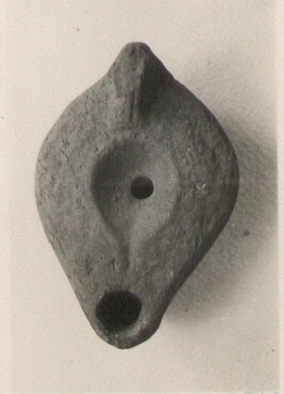 | Description: | On rim, vine pattern. Small, concave discus, with filling hole off center. Handle, solid, double grooved; top chipped. Plain nozzle. On reverse, remains of double almond-shaped groove. Unglazed; very crumbly. Light red clay. Type XXVIII of Corinth collection. | |
