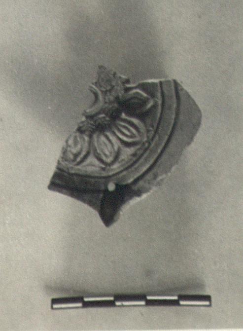| Description: | Half of discus and part of rim preserved. Plain rim with panels. Around central filling hole of discus, a rosette of petals. Unglazed. Reddish-buff clay. Type XXVIII of Corinth collection. | |