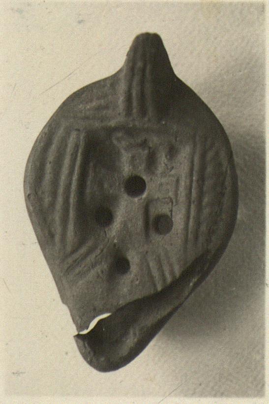 | Description: | On rim, herringbone on sides; diagonal lines near handle and nozzle. Square discus; Christian monogram with loop to right; three oil holes. Plain nozzle. On reverse, double almond-shaped groove, with palm branch. Unglazed. Light red clay. Type XXVIII of Corinth collection. | |
