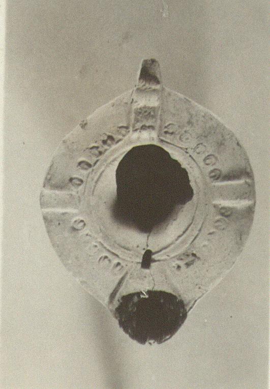 | Description: | Intact save for upper part of pierced grooved handle, broken off. On discus, Eros, right, playing double flute in front of an altar on which a fire burns. On rim, tendrils, with plain panels. Underneath, incised in the unbaked clay. Unglazed. Fine buff clay. Type XXVII of Corinth collection. <graphic> | |