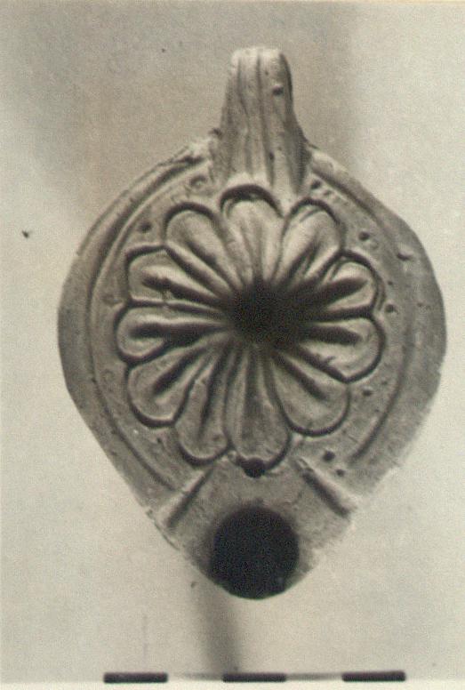 | Description: | Intact. Plain rim; rosette on discus. Small dots on edge of discus. Solid handle, double grooves above and below. Circular reverse with circular groove. Red clay and wash. Type XXVIII of Corinth collection. | |