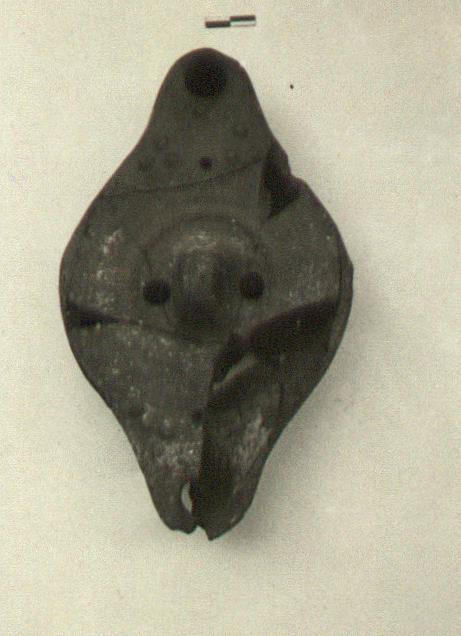 | Description: | On rim, circular band of herringbone pattern between ridges. Nozzles, one at either end of the lamp, with rudimentary volute decoration, enclosing three raised dots on either side of an air hole; half of the top of one nozzle missing. Central handle, rising from a plain discus, with an oil hole on either side; triple grooved; pierced On reverse, double circular grooves. Unglazed. Red clay. Type XXX of Corinth collection. | |