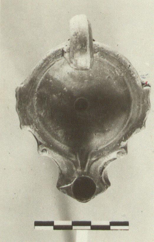 | Description: | Complete. Ring foot has three gaps, making very low tripod foot. Lug handles at sides, large plain discus. High vertical handle; triangular nozzle with volutes. Poor red to black glaze. Buff clay. Type XXII (?) of Corinth collection. ADDENDA Special forerunner of cotton-handle variety of type XXIV of Corinth collection. | |