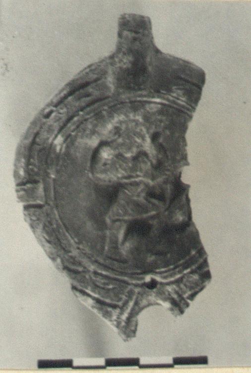 | Description: | Fragment of top. Scrolls on rim, with plain panels. On discus, a figure in a short chiton, right, but facing front, bow in left hand. At right a dog's tail (?) Artemis (?). Reddish clay and wash, stained. Type XXVIII of Corinth collection. | |
