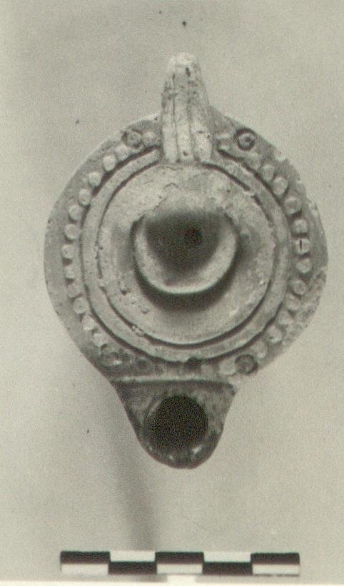 | Description: | Part of right side broken away. On discus, crescent; on rim, raised dots. Handle, unpierced, grooved, double above and below. On reverse, concentric grooves. Glaze wash dull red and flaky. Buff clay. Type XXVIII of Corinth collection. | |