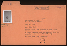 | Description: | A small fragment from the bottom, with the signature written in the wet clay. Unglazed. Pinkish-buff clay. Type XXVII of Corinth collection. <graphic> | |