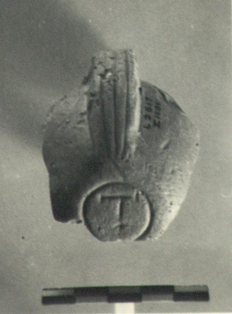 | Description: | Reverse and part of top, including handle, preserved. Curved wavy lines on discus, solid grooved handle; circular reverse with circular groove enclosing signature: "T". Light red clay and wash. Type XXVIII of Corinth collection. | |