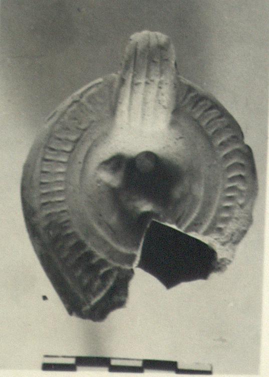 | Description: | Intact, except for nozzle and surroundings. Herringbone pattern on rim; dog (?), left, on discus. Solid grooved handle, with two stamped circles at its base. Small almond-shaped reverse, with two grooves around it, enclosing signature "K". Unglazed; from a very worn mould. Light red clay. Type XXVIII of Corinth collection. | |
