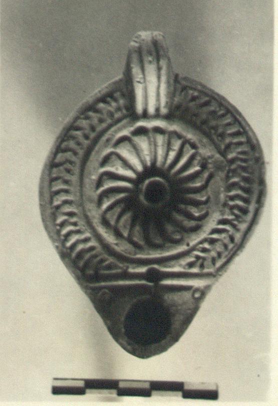 | Description: | Intact. Herringbone pattern on rim. Swirling rosette with pointed petals on discus. Solid grooved handle. Circular reverse, with triple concentric grooves enclosing stamped circle. Red glaze. Light red clay. Type XXVIII of Corinth collection. | |