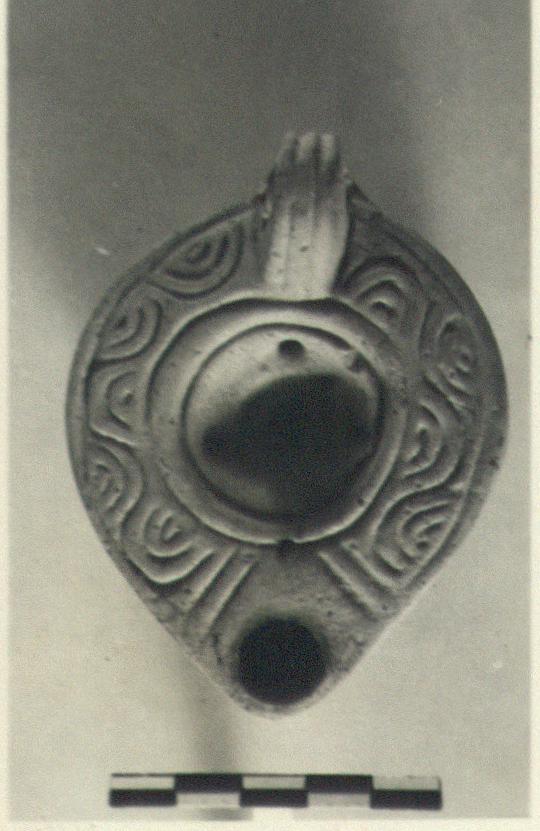 | Description: | Intact. Wavy lines on rim; grooves on discus, with three auxiliary filling holes besides the central one. Grooved handle, punched but not pierced. Broad almond-shaped reverse, with double grooves enclosing signature. Unglazed. Light red clay. Type XXVIII of Corinth collection. <graphic> | |