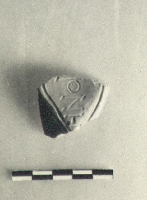 | Description: | Fragment of front of reverse preserved. Almond-shaped reverse with grooves enclosing signature. Unglazed. Pinkish-buff clay. Type XXVIII of Corinth collection. <graphic> | |