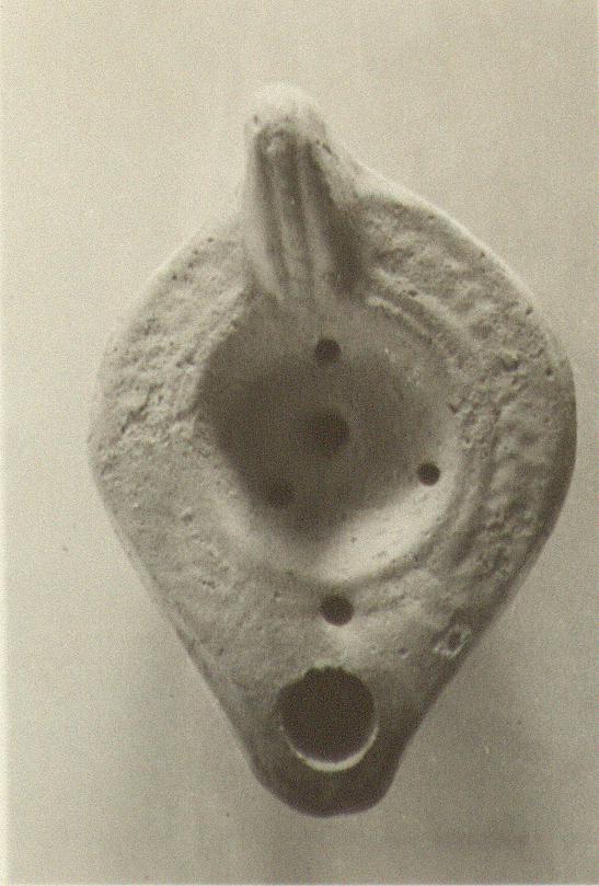 | Description: | Intact. Discus plain; on rim, faint herringbone design. Handle, unpierced, grooved; above, double, below triple. On reverse, faint design, within almond-shaped grooves. Unglazed. Pinkish-buff clay. Type XXVIII of Corinth collection. | |