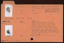 | Description: | Large handle, triangular, set at an angle to the body of the lamp; triple ridge down center, from which spring several diagonal ridges, giving a leaf-like effect. The back of the handle has a very low double ridge, continous with a similar base ring. The handle is hollow, continuous with the interior of the lamp. No trace of glaze. Pinkish-buff clay. Type XXVIII (?) of Corinth collection. | |