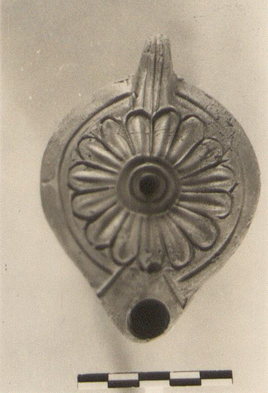 | Description: | Handle unpierced. Petals on disc. Five stamped concentric circles on bottom. Poor red glaze. Type XXVIII of Corinth collection. | |