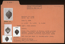 | Description: | Intact. Plain rim, rosette on discus, solid grooved handle. Circular reverse with double concentric grooves enclosing signature: "ONA". Red wash (?) burned quite black. Red clay. Type XXVIII of Corinth collection. | |