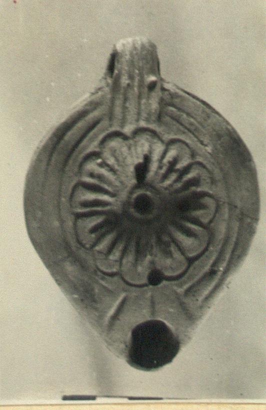 | Description: | Largely intact. Two concentric grooves on rim, rosette on discus, with three auxiliary filling holes, besides central one. Grooved handle, punched but not pierced. Almond-shaped reverse with grooves around it. Light red clay and wash, burned. Type XXVIII of Corinth collection. | |