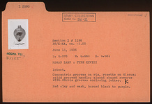 | Description: | Intact. Concentric grooves on rim, rosette on discus; solid grooved handle; almond-shaped reverse with double grooves enclosing letter "K". Red wash, burned black to purple. Red clay. Type XXVIII of Corinth collection. | |