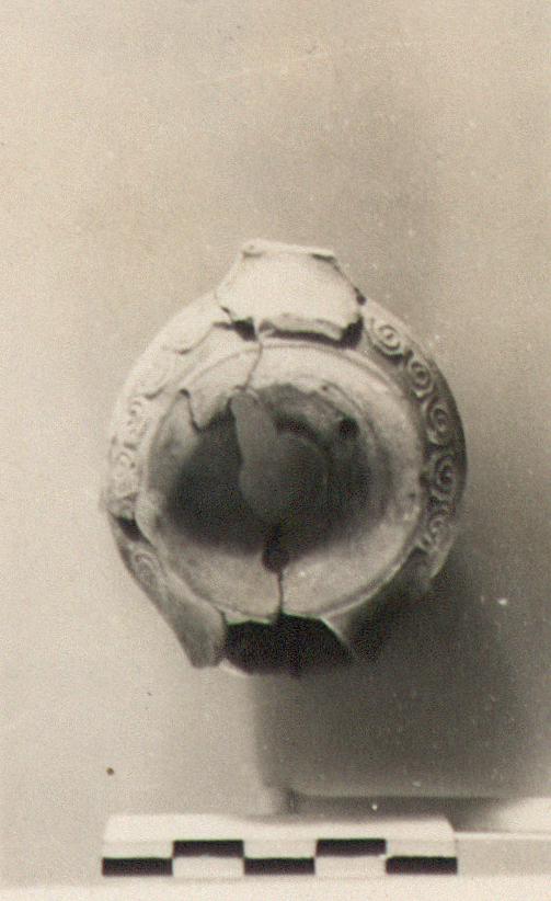 | Description: | Handle, nozzle, most of base, missing. A high edge around discus which has three small holes around infundibulum. Small spirals in relief on shoulder. Low base without foot ring. Traces of dull black glaze. Fine gray clay, highly micaceous. Type XIX of Corinth collection, type 49A of Agora collection. | |