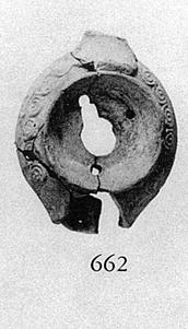 | Description: | Handle, nozzle, most of base, missing. A high edge around discus which has three small holes around infundibulum. Small spirals in relief on shoulder. Low base without foot ring. Traces of dull black glaze. Fine gray clay, highly micaceous. Type XIX of Corinth collection, type 49A of Agora collection. | |