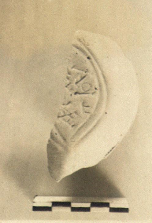 | Description: | Part of almond-shaped reverse only preserved. Letters within double grooved lines. Orange-red clay. Type XXVIII of Corinth collection. <graphic> | |
