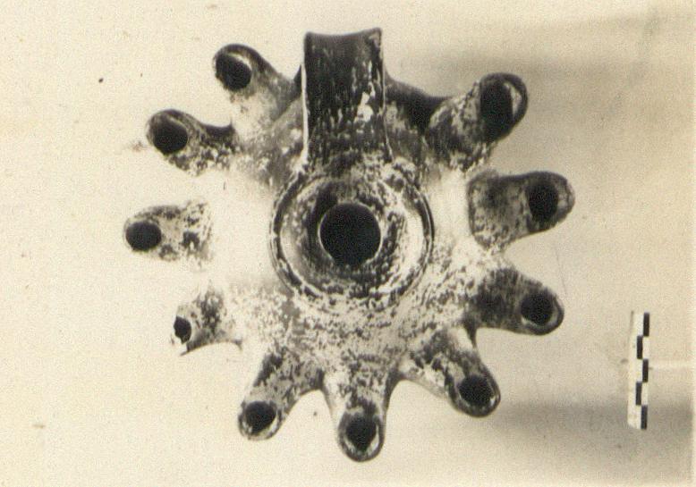 | Description: | Complete except for the end of one nozzle. Large lamp with ten nozzles on a low base; wide vertical strap handle. Concave rim around filling hole, with a groove around its outer edge. Entirely covered with black glaze. Wheel made. Type XII (early spreading variety) of Corinth collection, type 34B of Agora collection. | |