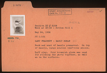 | Description: | Back and most of handle preserved. On top of handle, large moulded leaf-like shield. Poor brownish glaze was used for sticking the parts together, as well as on the surfaces. Buff clay. Type XXI of Corinth collection. | |