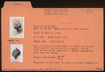 | Description: | Most of discus broken away. In relief an object which may be the bottom of a basket, filled with fruits which hang down. Handle unpierced. Signed underneath. Poor dark red glaze. Type XXVIII of Corinth collection. ADDENDA Fagments of at least two more with same signature. <graphic> | |