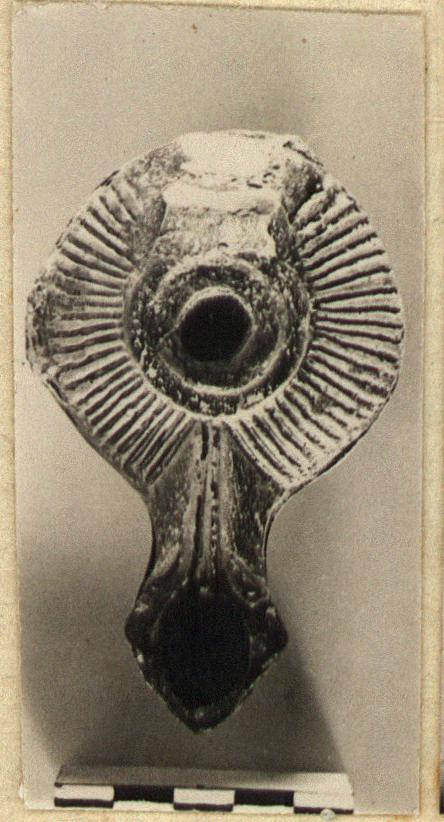 | Description: | Handle missing. Triangular nozzle, sunken base, and knob on right side. Ribs on the rim; low raised band about the small discus. Metallic brown to black glaze. Brownish-red clay. Type XVIII of Corinth collection, type 52C of Agora collection. ADDENDA Hellenistic or Early Roman (?). | |
