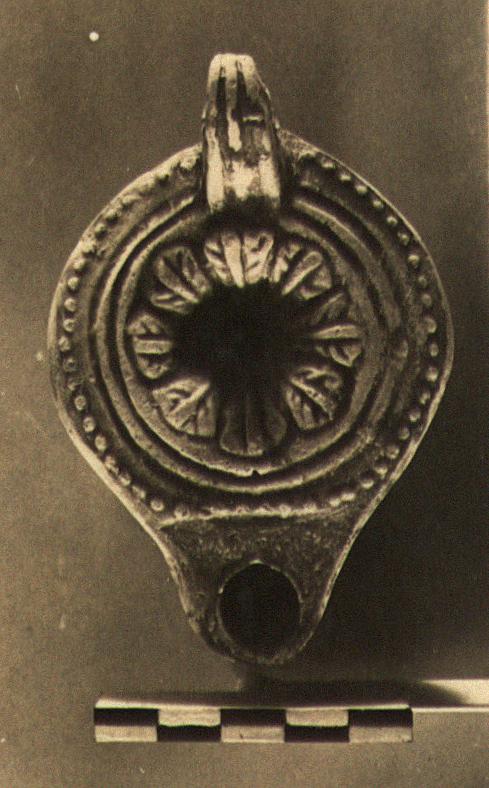 | Description: | Partially pierced grooved handle, dots on rim, leaf rosette on discus. Three concentric grooves on the reverse; herringbone at base of handle. Red to brown paint, worn. Type XXVIII of Corinth collection. | |