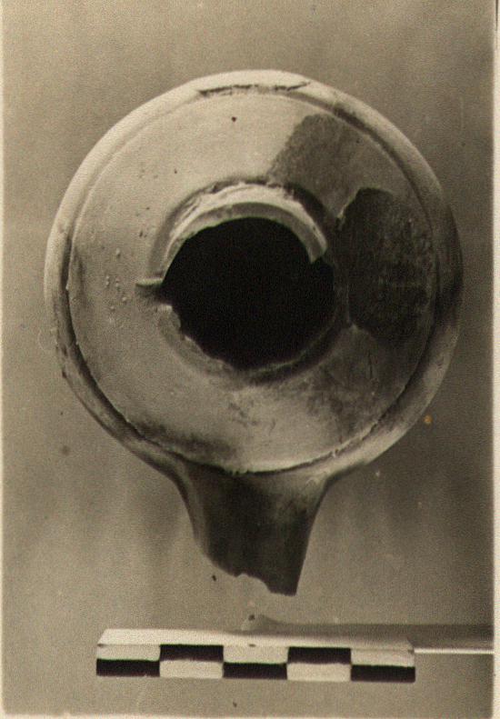 | Description: | End of nozzle, handle, and part of collar about filling hole missing. Raised base, flat beneath; top set off from side wall by shallow groove, high collar around filling hole. Flat-topped nozzle. Breaks in surface indicate vertical handle, and knob on right side. No glaze. Pinkish-buff clay. Type VIII (domed variety) of Corinth collection, type 25 variant of Agora collection. | |