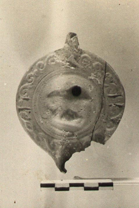 | Description: | Top of handle and most of nozzle missing. Double spirals on rim. Bull left on discus; heart-shaped leaf with three circles in relief on bottom. Unglazed. Light red to brown clay. Type XXVIII of Corinth collection. | |
