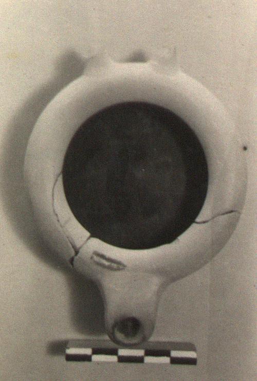 | Description: | Loop handle missing. Flat raised base; incurved rim, nozzle flat on top with small wick hole. Good black glaze on interior; exterior, unglazed, polished surface. Type IV of Corinth collection, type 21C of Agora collection. | |