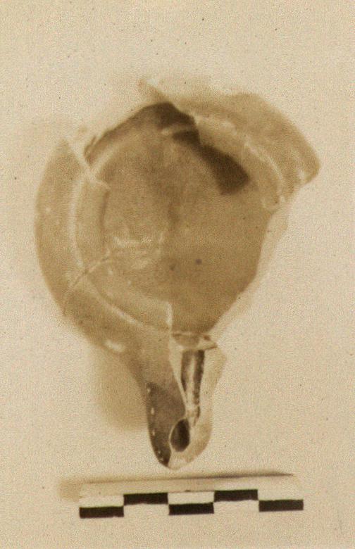 | Description: | Handle, pieces of side and part of nozzle missing. Flat raised base. High rounding sides; groove on rim. Attachment marks of horizontal loop handle preserved. Dull black glaze except for reserved bottom. Grayish-buff clay. Type V (second variety) of Corinth collection, type 24A of Agora collection. | |