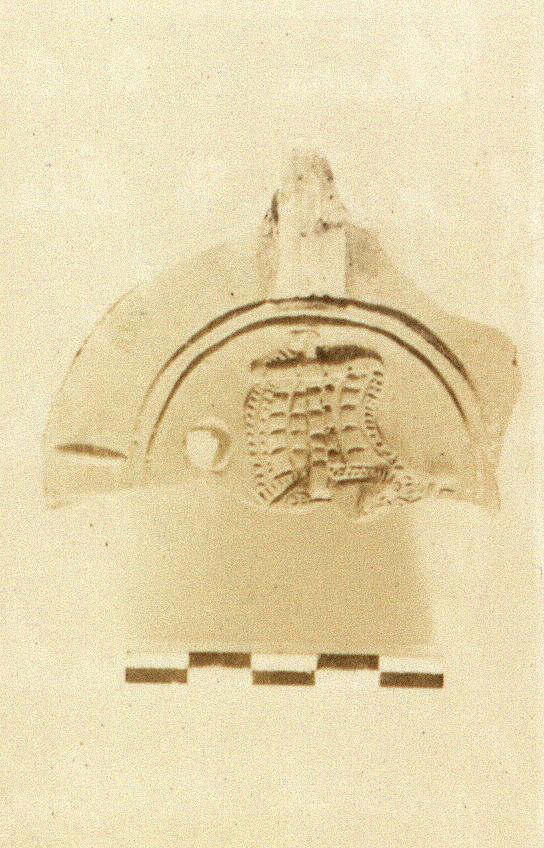 | Description: | Handle, part of rim and discus preserved. Handle semi-pierced. Rim plain. On discus, the square sail of a boat. Damaged by fire. Type XXVIII of Corinth collection. | |