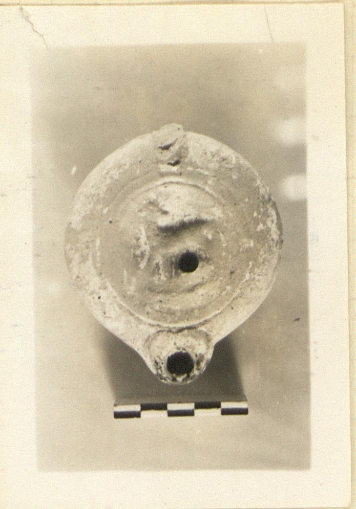 | Description: | Handle missing. Traces of ovules around rim (?); standing dog left, with head turned back on discus. Much peeled red glaze, on white. Micaceous russet clay. Type XXV of Corinth collection. | |