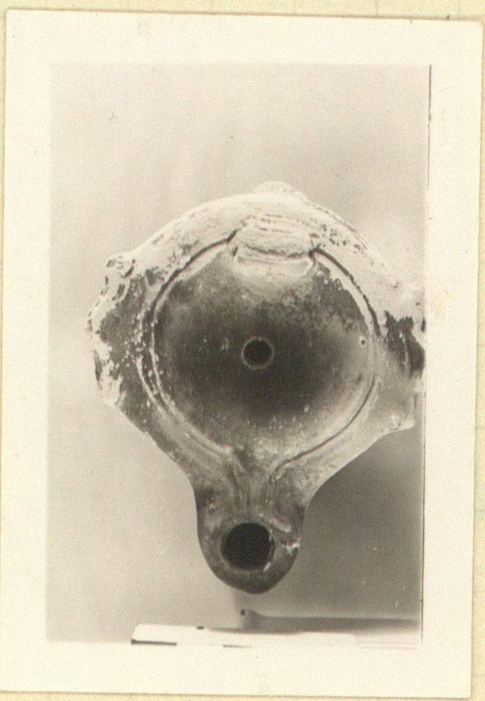 | Description: | Vertical handle at back broken away. Ribbon lugs at sides of rim. Signed underneath: "alpha". Red to black glaze. Type XXIV of Corinth collection. | |