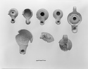 | Description: | Nozzle broken, handle missing, and chips from edges. Coarsely made wheel made lamp with broad flat bottom, vertical walls and convex top set off from walls by a flaring edge. Groove around filling hole; four air holes in top near edge. Raised edge surrounds top only, not nozzle. Traces of brownish-red glaze. Light red to buff clay. Type 39 of Agora collection. | |