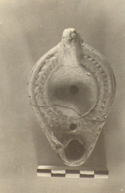 | Description: | Herringbone on rim; discus plain. Underneath, within two almond-shaped grooves, the signature. Unglazed. Red clay. Type XXVIII (late shape) of Corinth collection. <graphic> | |