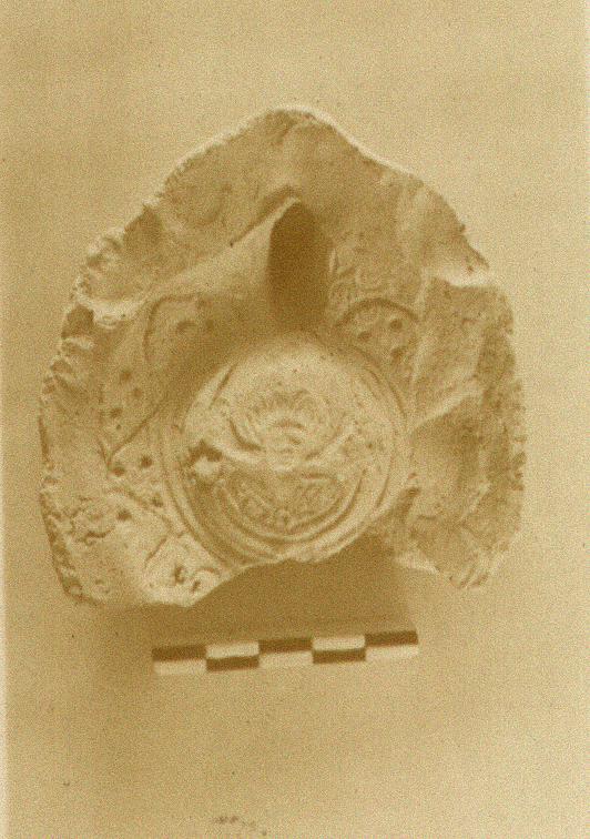 | Description: | Intact except for front part of rim and nozzle; worn. A mold for the upper portion, with solid handle. Discus has female bust, facing, with crescent moon above shoulders. Rim has globules and wavy line. Rather coarse light-red clay. For lamp of type XXIX of Corinth collection. ADDENDA 22 March 1950: A second fragment (section Π 699), Old Cut, layer 2-3, found; joins first, giving mold complete except for chips. | |