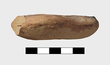 Shallow angular body. On rim, palm branch and raised dots; on discus, conventional design of lines and dots, extending along channel to nozzle.