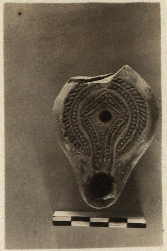 Shallow angular body. On rim, palm branch and raised dots; on discus, conventional design of lines and dots, extending along channel to nozzle.