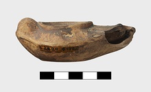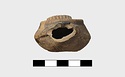 | Description: | Part of end of nozzle broken; otherwise intact. Plain discus with small central filling hole; raised ring aroud it. On rim, ovules. Between nozzle and discus, grooved tongues. Handle, broad, solid with seven grooves above and three grooved tongues below. On reverse, slightly raised oval base ring. Very thin dull black to brown glaze. Imitation of Hellenistic type. | |
