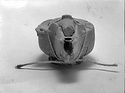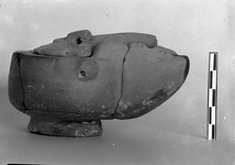 | Description: | Body mended from many pieces; complete except for fragments of top, and chips. Lid complete except for tip, and chips. Deep bodied lamp on high base; walls nearly vertical; broad rim slightly insloping, light groove near outer edge; pierced lug at left. On both sides of the nozzle is added a high raised edge. A handmade lid fits the top and extends towards the nozzle, between the raised edges. A rectangular knob on the top of the lid is pierced horizontally; below is a small round projection to fit the filling hole. Unglazed outside; black glaze, irregular inside. Type VIII (conventional variety) of Corinth collection, type 25D' of Agora collection. | |