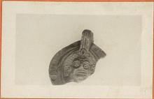 | Description: | Rear half only preserved. Rim, panelled with herringbone pattern and circles. On discus, a scowling face in high relief. Handle solid, triply grooved above; doubly below. Thin red glaze. Red clay. Type XXVIII of Corinth collection. | |