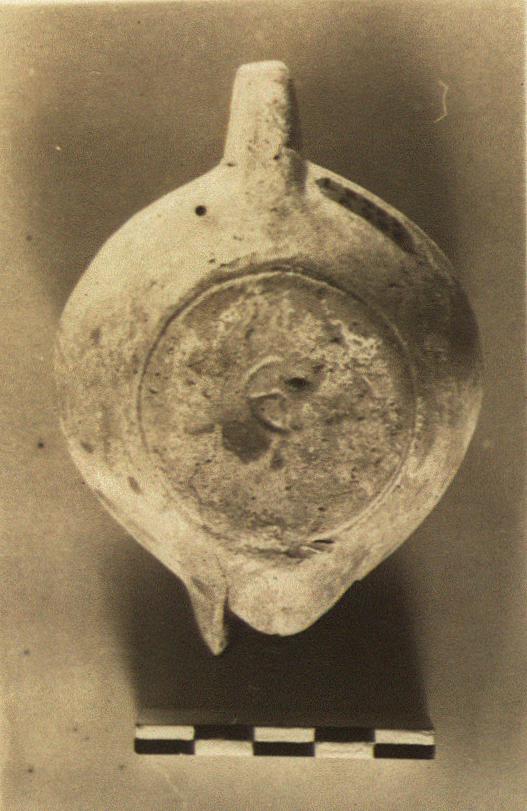 | Description: | Discus and nozzle missing. Shallow groove about outer edge of flat bottom incised "epsilon" in center. White slip and orange-red glaze, both badly flaked. Red-brown clay. Type XXV of Corinth collection. | |